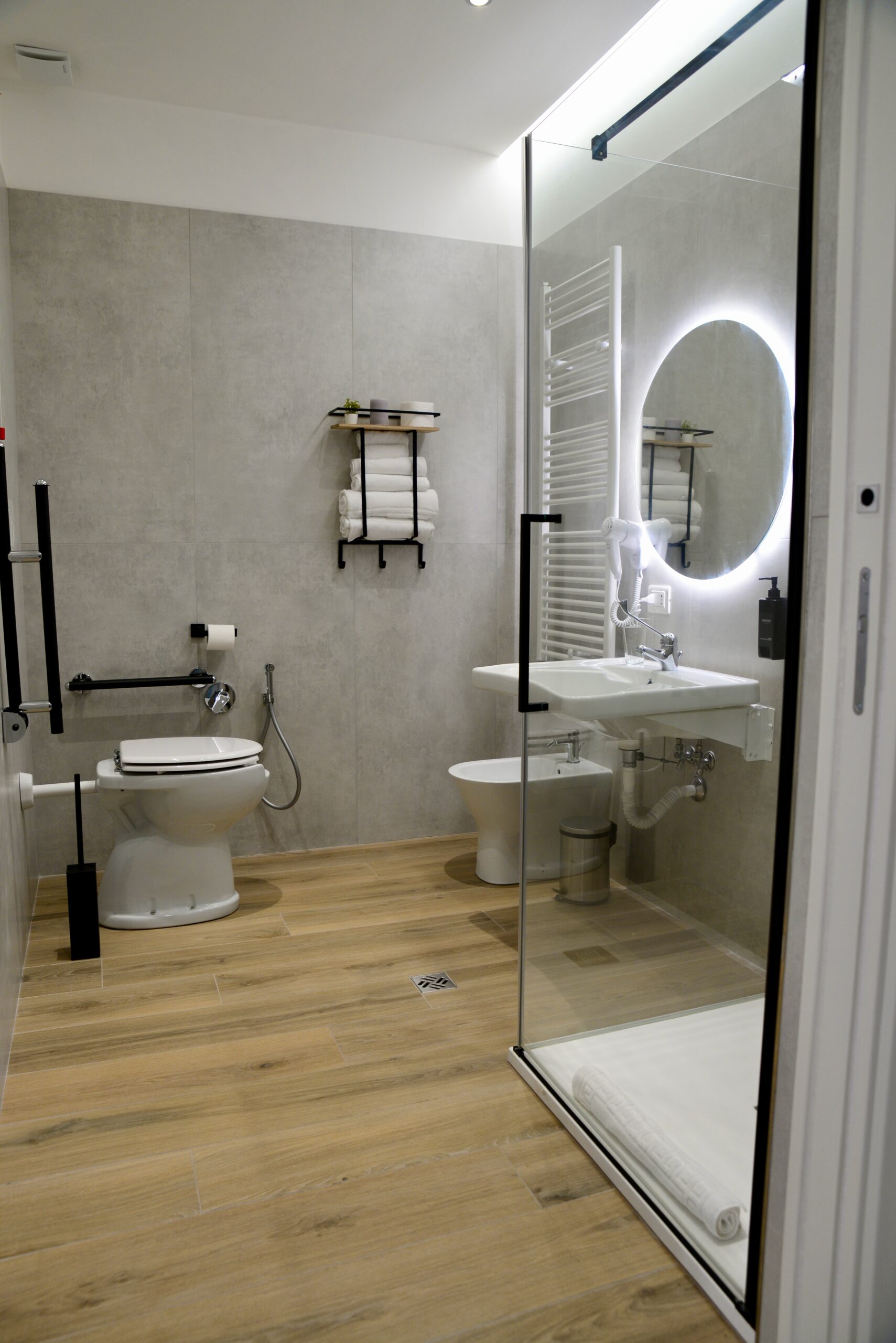 E' la nostra camera con accesso disabili. Gli spazi sono molto ampi, adatti a girare comodamente anche con una sedia a rotelle. Tutti gli ingressi sono di gran lunga superiori ai 90 centimetri imposti dalla legge. Il bagno è enorme e finemente arredato e la doccia è la più grande che abbiamo a disposizione